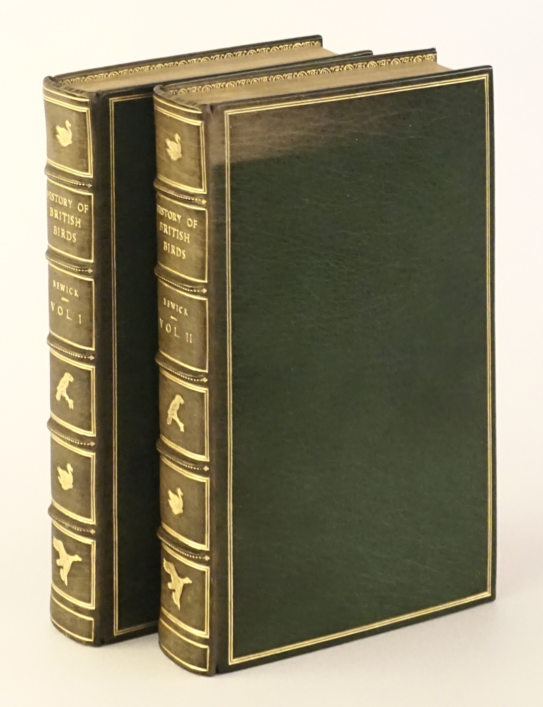 Newcastle: Printed by Edward Walker, for T. Bewick: Sold by Him, and Longman and Rees London, 1804 (1814-1816). 1st and 5th edition. Vol. 1: XXVIII + 386 + 50 pp. Vol. 2: XX + 400 + 50 pp. ‘Water Birds’ first edition (1804), Roscoe 17B, variant B. ‘Land Birds’ fifth edition (1814-1816), Roscoe 21, variant B. Supplements Roscoe 29 & 30. Richly illustrated with Bewicks woodcuts. Previous owner’s bookplate in both volumes. Green full morocco-binding. All edges gilt and with gilt ornamentation to inner and outer borders, gilt decorations to spine. Spines a little sunned, also part of front board of vol. 2 (see photo). Bound (and stamped) by Brian Frost & Company, Bath, Eng.