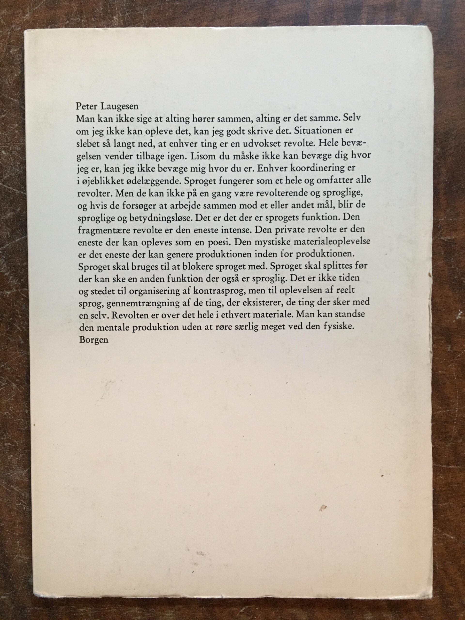 Man kan ikke sige at alting hører sammen, alting er det samme. Selv om jeg ikke kan opleve det, kan jeg godt skrive det. Situationen er slebet så langt ned, at enhver ting er en udvokset revolte. Hele bevægelsen vender tilbage igen. Lisom du måske ikke kan bevæge dig hvor jeg er, kan jeg ikke bevæge mig hvor du er. Enhver koordinering er i øjeblikket ødelæggende. Sproget fungerer som et hele og omfatter alle revolter. Men de kan ikke på en gang være revolterende og sproglige, og hvis de forsøger at arbejde sammen mod et eller andet mål, blir de sproglige og betydningsløse. Det er det der er sprogets funktion. Den fragmentære revolte er den eneste intense. Den private revolte er den eneste der kan opleves som en poesi. Den mystiske materialeoplevelse er det eneste der kan genere produktionen inden for produktionen. Sproget skal bruges til at blokere sproget med. Sproget skal splittes før der kan ske en anden funktion der også er sproglig. Det er ikke tiden og stedet til organisering af kontrasprog, men til oplevelsen af reelt sprog, gennemtrængning af de ting, der eksisterer, de ting der sker med en selv. Revolten er over det hele i ethvert materiale. Man kan standse den mentale produktion uden at røre særlig meget ved den fysiske. Borgens Forlag, 1969. 88 sider. Heftet med orig. omslag. Diskret ejerstempel, ellers pænt eksemplar.
