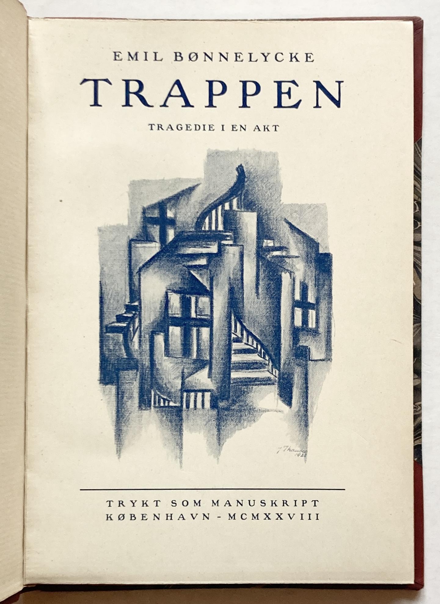 Trykt som Manuskript, København, 1928. 46 sider. Priv. halvlæderbind med guldtopsnit og orig. for- og bagomslag medindbundne. Stemplet af Anker Kyster. Exlibris. Ryg lidt solfalmet. Blyantsinskription på smudstitel. Nr. 17 af 100 nummererede eksemplarer, signeret af Emil Bønnelycke.